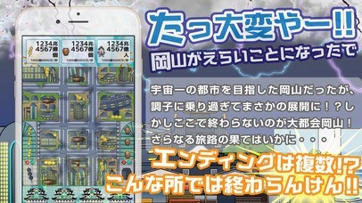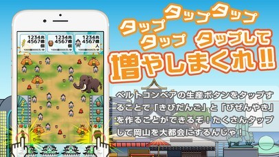 岡山を田舎から世界一の大都会に発展させていくゲームです。きびだんご工場とびぜんやき工房をタップすることで名産のきびだんごとびぜんやきをどんどん生産していきます。きびだんごとびぜんやきを売ると岡山の「けんみん」が増えるので、今度はけんみんによって工場・工房・岡山の街を育成します。 工場や工房が大きくなると自動できびだんごとびぜんやきを生産してくれるので、放置しておいても大丈夫です。エンディングは複数用意されているので何回でも楽しめます。