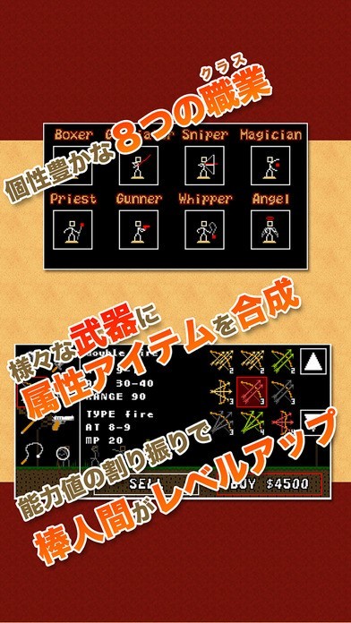 個性豊かな8つの職業。様々な武器に属性アイテムを合成。レベルアップ時の能力値の割り振りで自分だけの棒人間を育てよう!