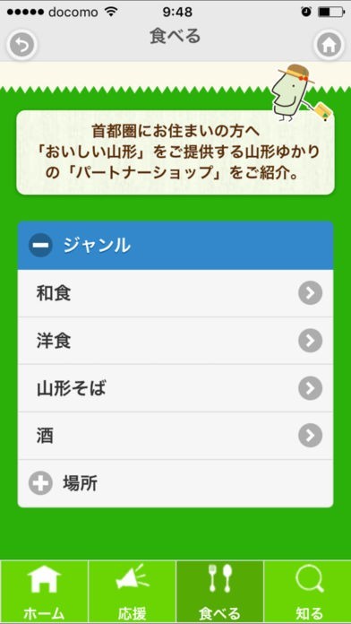 「ジャンル」「場所」からお店を検索し、山形の味が味わえる「パートナーショップ」へ足をお運びください。