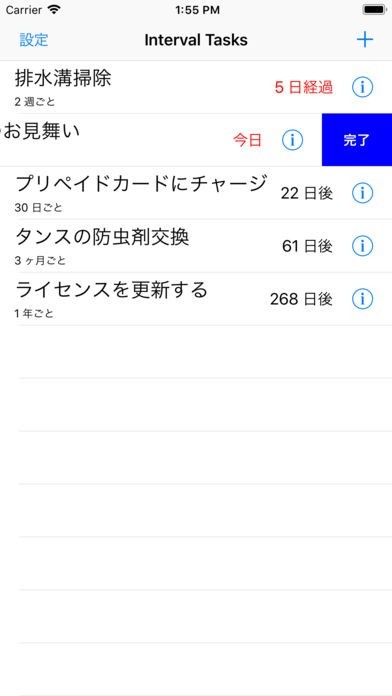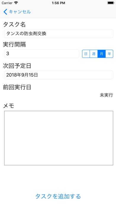 App Storeより引用厳密に決まった間隔でやらないといけないわけじゃないけど、前回実行してから決まった期間が経ったら教えて欲しい繰り返しのタスクってありますよね。例えば、タンスの防虫剤を三ヶ月ごとに取り換えるとか、道具を10日使ったら手入れするとか。一定期間ごとにきっちり決まった日にやらないといけないわけじゃないけど、実行してから一定期間経ったらまた実行するように教えて欲しい。そんな時、標準のリマインダーの繰り返し通知では厳密すぎると感じたら、このアプリを使ってゆるく繰り返しタスクを管理してください。