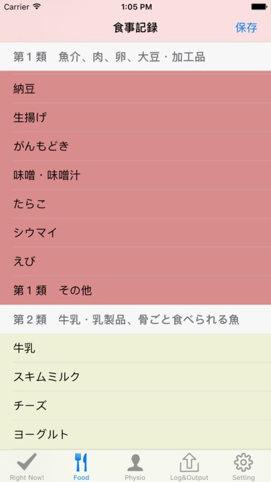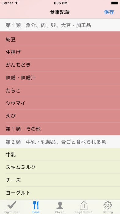 2.「食事記録」では毎日の食事をスマートに記録できます。代表的な料理や食材を管理栄養士の指導に基づきリストアップしました。なお、食材リストは旧厚生省の「6つの基礎食品」に基づき整理されています。ダイエットや生活習慣病対策などに幅広く活用して頂けます。