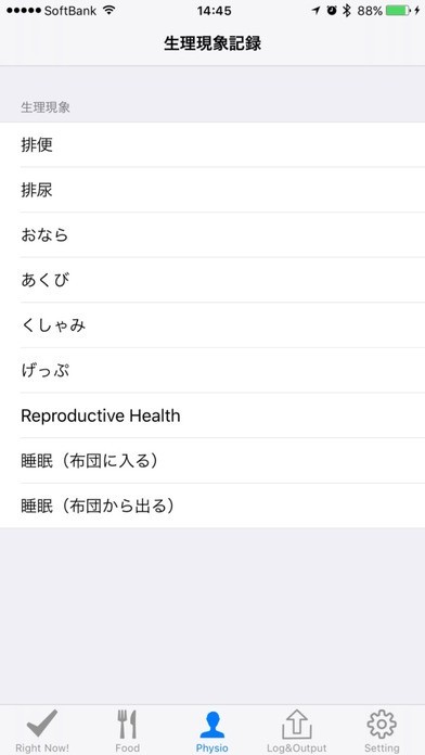 3.「生理現象記録」では排泄や排尿などのデリケート情報を記録できるようにしました。忘れがちなデリケート情報を簡単に記録できるため健康管理の協力な武器となります。