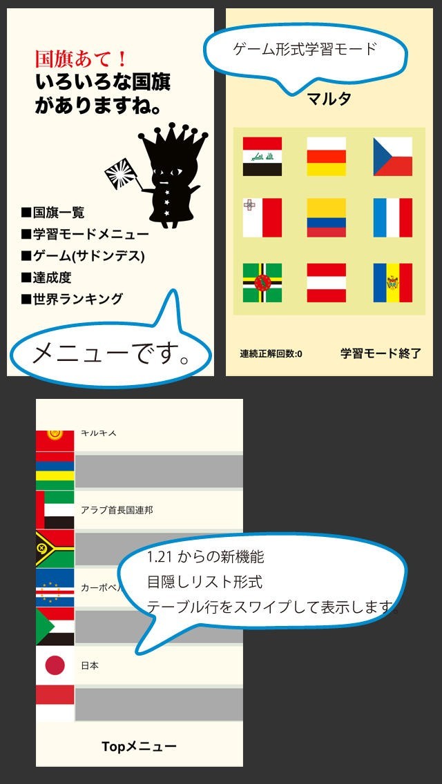 メニューは、国旗一覧、学習モード、ゲーム(サドンデス)という構成になっています。