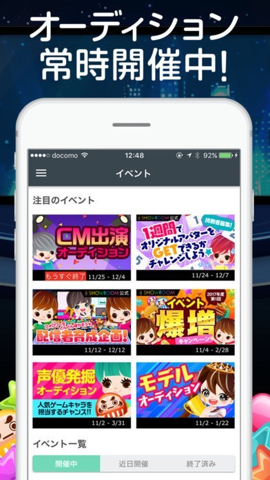 サイドメニューの「イベント」から随時開催されている各種オーディション情報をチェックできる!