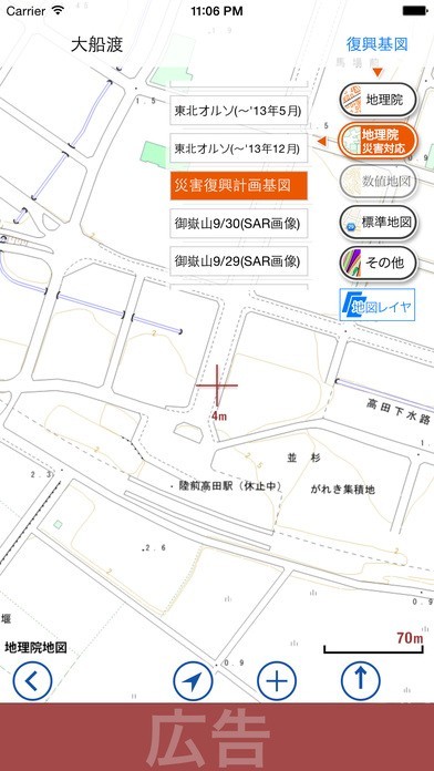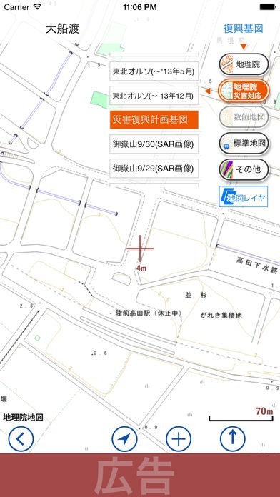 スマートフォンからオンラインで提供している地理院地図や数値地図を利用することができるアプリとなっていて、地理院地図はキャッシュしておくことでオフラインでも利用可能です。