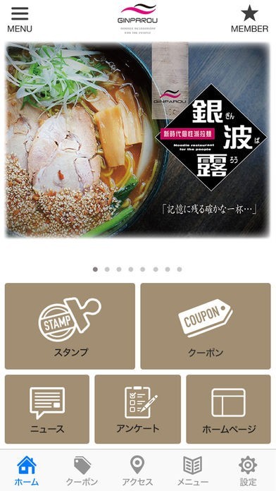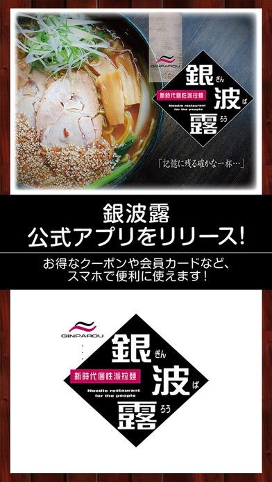 ラーメン店「銀波露」が公式配信するアプリとして、店舗の最新ニュースや新作情報をたっぷり掲載しています。会員証機能を搭載しており、バーコード画面を店頭で提示することで、会員証としても利用できます。
