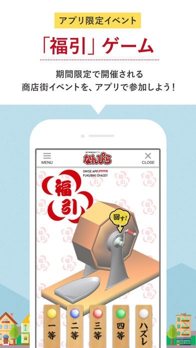 商店街イベントと言えば「福引」!期間限定で開催されるイベントを、アプリで参加しよう!他では楽しめない、アプリだけの楽しいゲームイベントが盛りだくさん!