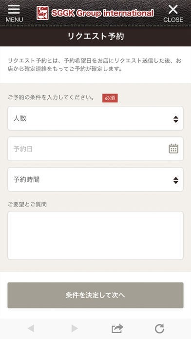 希望の人数・日時を指定して送信するだけで予約を依頼できます。