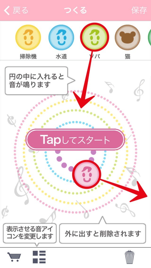 赤ちゃんが泣いてしまった時、泣き止むきっかけとなる泣き止み音を自分で作れるお役立ちアプリです。泣き止み音をつくる画面で、上にある水道や掃除機、ネコ等のアイコンをドラッグして音を作っていきます。とても簡単で楽しく作れるので、パパやママも苦にならず楽しく泣き止み音が作れます。