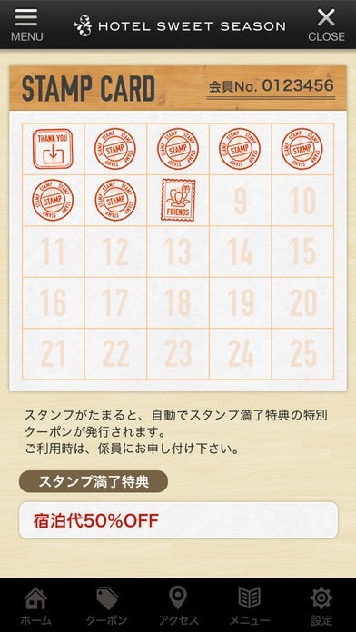 このアプリでは、ホテル「sweet season」の色々な情報やアプリユーザー限定のお得なサービスが手に入ります!