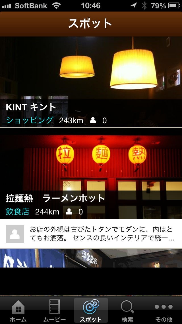 地図や解説だけでなく、位置情報を利用したソーシャルサービスのfoursquareと連動し、投稿写真やコメントも確認することができます。その場所が登場するムービーへもすぐにアクセスすることができます。