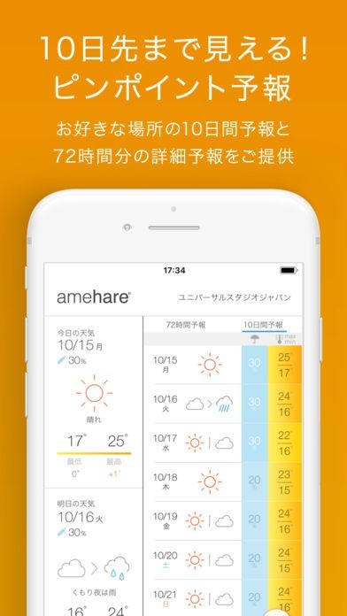 「amehare〈アメハレ〉 - 使いやすさとデザインにこだわった天気予報アプリ -」のアプリとは、とにかく使いやすさと美しいデザインにこだわっている天気予報アプリであり、他のインターネットサイトやアプリよりも最新のお天気情報を入手することが可能です。10日間予報・72時間分の1時間予報・24時間前から6時間先までの雨レーダーなどの機能も搭載されているので情報を正確に入手できます。操作性もシンプルとなっているので誰でも気軽に使用することができます。