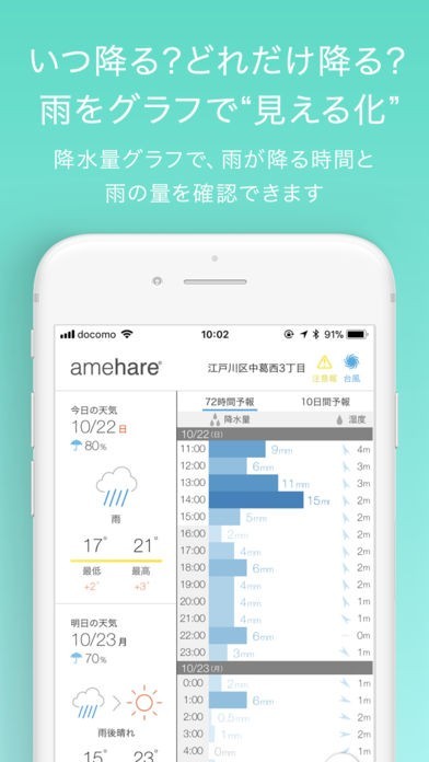 メリット:天気予報を色やグラフで情報をカラフルに表示!配色は気象庁のガイドラインに準じたもので、見た目も美しく見ているだけで楽しめます