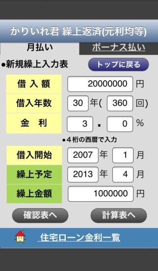 App Storeより引用「かりいれ君 繰上返済」はiPhone、iPod touch用の簡単に住宅ローン等(元利均等)の繰上返済 をシミュレーションするアプリです。分かりやすい画面で繰上返済の効果を確認する事ができます。