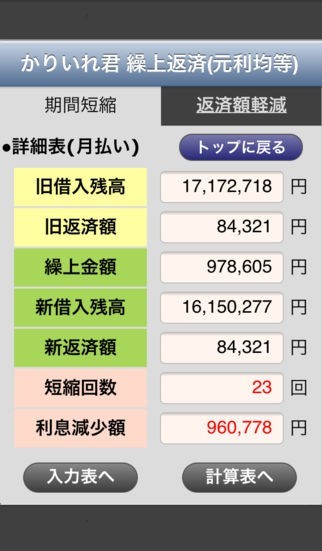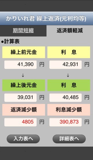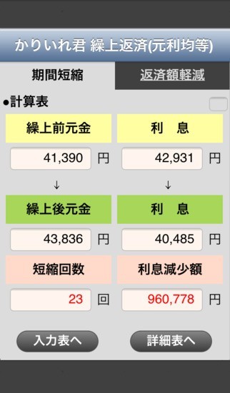 期間短縮と返済額軽減の繰上返済結果を表の上部のタブをタップする事で簡単に切り替える事ができます。