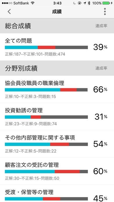 成績表示では総合と分野別に解いた問題数と正解数、不正解数を確認できます。達成度がパーセントとグラフで表示されるので、分かりやすく学習の習熟度もチェックできます。