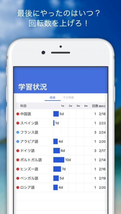 記憶を定着させるには繰り返し問題を解く(回転する)ことが重要です。回転の進ちょく状況を確認することはモチベーションをキープするのに役立ちます。