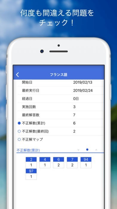 - 誤解答の回数を指定して選択可(5回以上間違えた問題など)