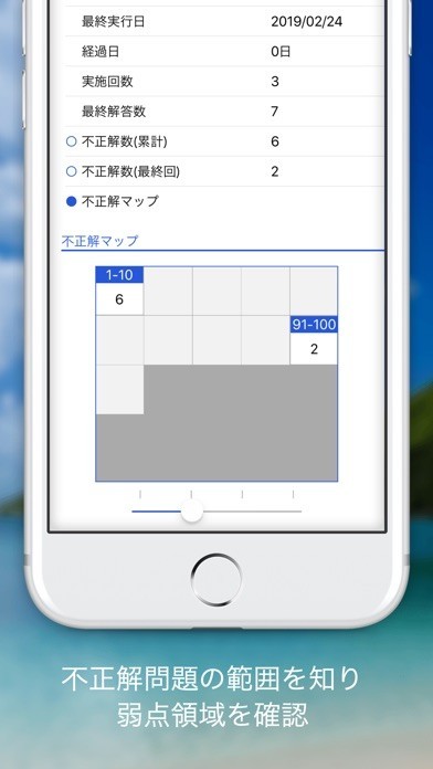 - マップ表示で誤問番号の範囲を表示(問題集で不正解問題が集中している問題領域を確認できる)