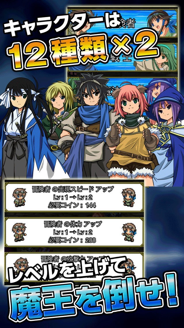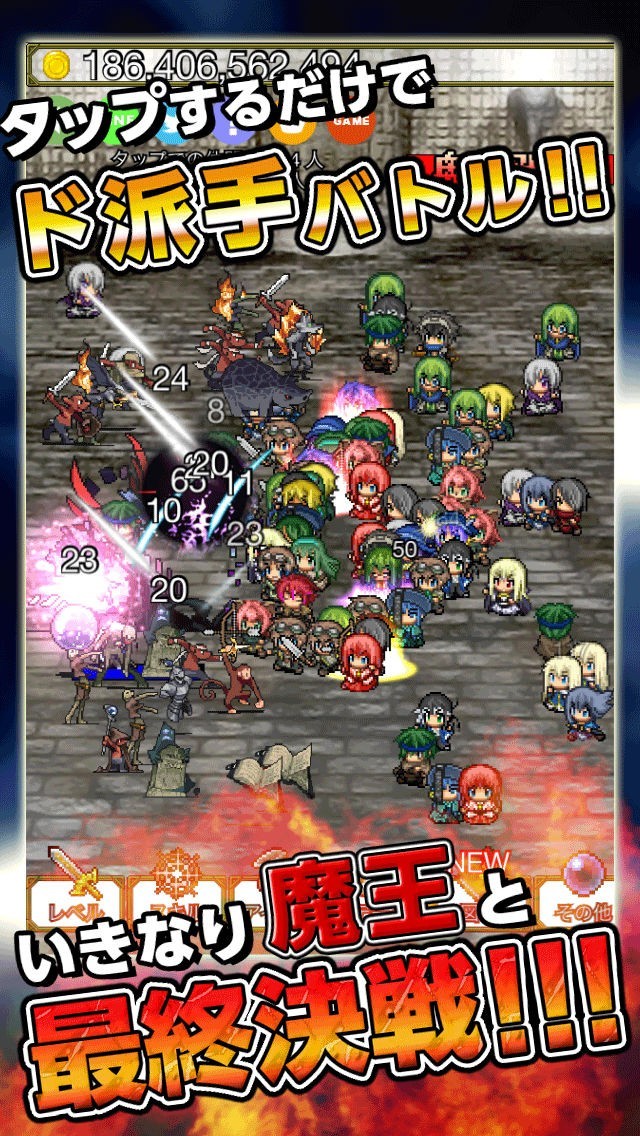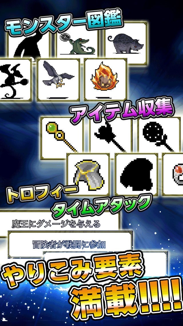 「魔王が強すぎて勇者がヤバい!!」はいきなり魔王との最終決戦からスタートするタップアクションゲームアプリです。タップすることで仲間をたくさん呼び寄せて数の力で強力な魔王を倒すことできるようになっていて、30分に一度ためることができる覚醒パワーを使って強力な攻撃を繰り出すことが出来るようになっています。勇者がやられると得ることができるコインを使ってパワーアップしたり、モンスターたちを倒すことで得ることができるアイテム引換券を使って強力なアイテムをゲットすることができます。モンスター図鑑やタイムアタックなどコレクション要素も多数用意されています。