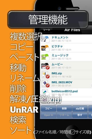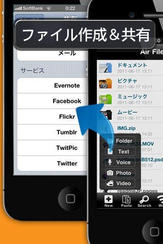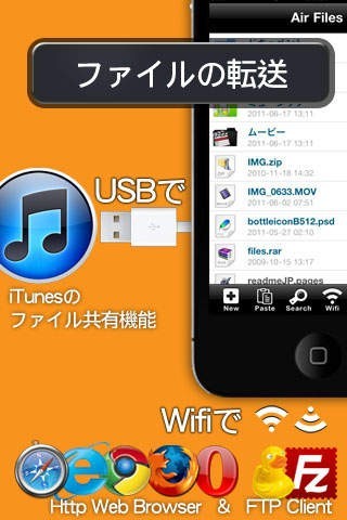 「ファイル君 Lite」にはブラウザ、WEBDAV、FTPと3つの転送機能が付いており、その中から使いやすいものを選べます。 まずはスマホをWifi接続、AirFileを起動してWifiボタンを押します。 スマホの画面に表示されたIPアドレスをWifi接続したパソコンにて入力します。 アップロード画面が表示されたらパソコンにて共有したいファイルを選び、アップロードすればスマホからでも閲覧ができるようになります。 コピー&ペースト、移動、リネームなどが行える管理機能も付いています。 画像や動画、オフィス、ドキュメント、ウェブページなど様々なファイルに対応、仕事で作成したファイルを他の社員とやり取りしている時にも便利です。