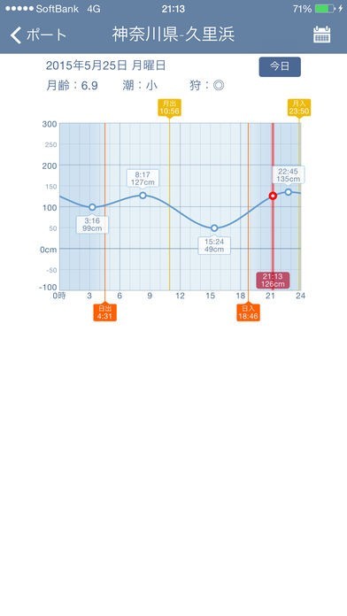 指定した場所の潮汐グラフが見れるので、時間によるグラフの変化が見れて参考になりました。