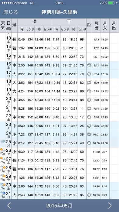 満潮干潮の時刻やその高さ、そして天気、月の出入りの時間と様々な数値が表で閲覧できます。また表は一か月分を先取りしてチェックできるので、予め釣りの計画を立てたい時に便利です。