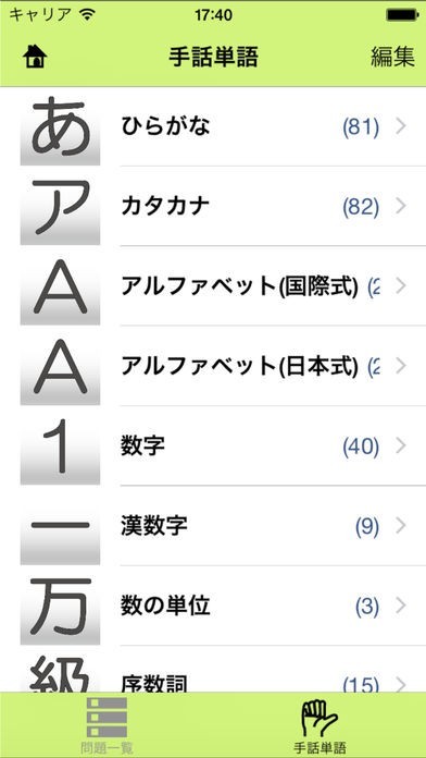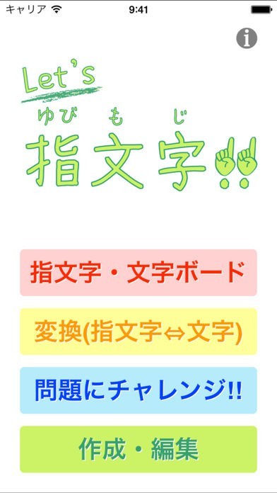 指文字と文字を相互に変換するテストが用意されています。「トレーニング」「トライ」など、テストは難易度が分かれているため、段階的に学習を進めることができます。また、問題の編集や追加ができるので一緒に学ぶ友人と問題を出し合うのも楽しいでしょう。