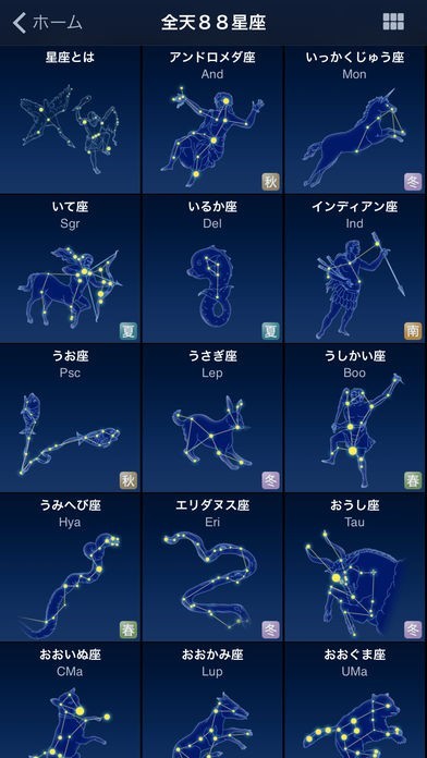 88個の星座の歴史や位置など星座についての多彩な知識を学習できる星座アプリ、イラスト付きの分かりやすい解説が魅力