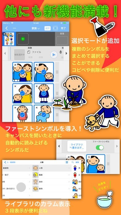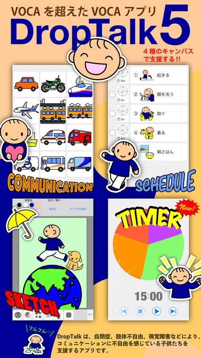 「DropTalk HD」は、生まれつき話すことが苦手な方でもイラストや音声を使ってコミュニケーションが取れるアプリです。話し言葉に頼らずとも自分の感情や意見を伝えられます。