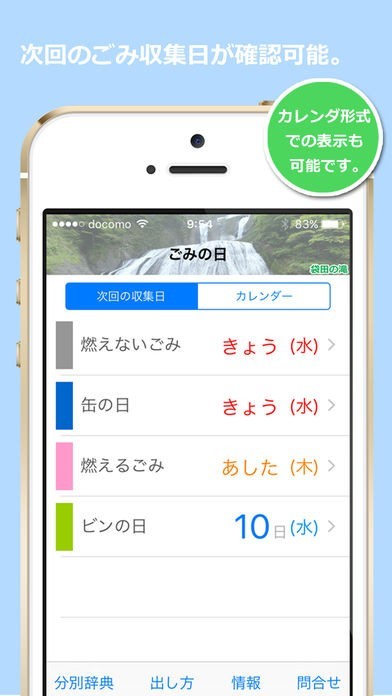 ・カレンダ形式 の他, 次回収集日 で見やすい表示で、ごみ出