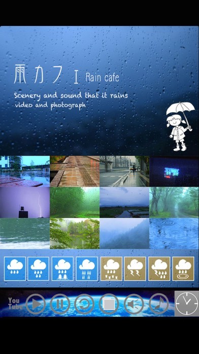■雨カフェは12パターンの雨のHD風景映像と8パターンの雨音をワンタッチで切り替えて再生することが出来ます。また雨音や貴方の好きな音楽に合わせて映像を再生したり雨写真をスライドショー再生することが出来ます。