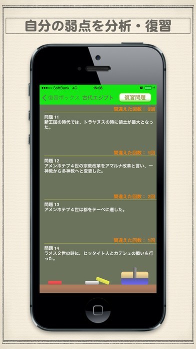 このアプリの内容は東大を卒業した方が作っており、成功体験を存分に活かしたノウハウを得ることが出来ます。 また、項目が細かく分類されていることから学びたい内容をタップすることですぐに学習をし始めることが出来ます。具体的に学んでいく過程としては問題にマルバツで答えていくといったことでどんどんと知識を蓄えていくことができます。 また、間違ってしまった場所はまとめて復習することが出来ますし、分析も行ってくれます。 加えて問題と関連する動画を見ることができることから解らなかった部分をしっかりと学習することもできるようになります。
