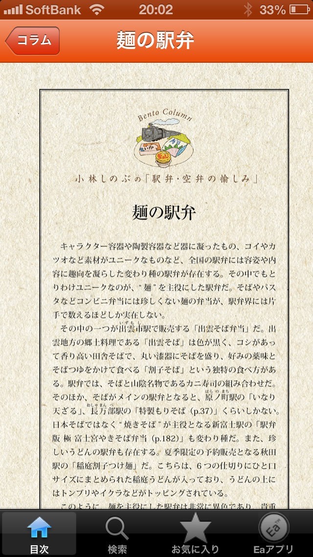 麺の駅弁などの特集コラムも入っているので、駅弁を探す時に参考になります。画像からお弁当を探すこともできるので、見た目が惹かれたものをチョイスして詳細を見ることもできます。