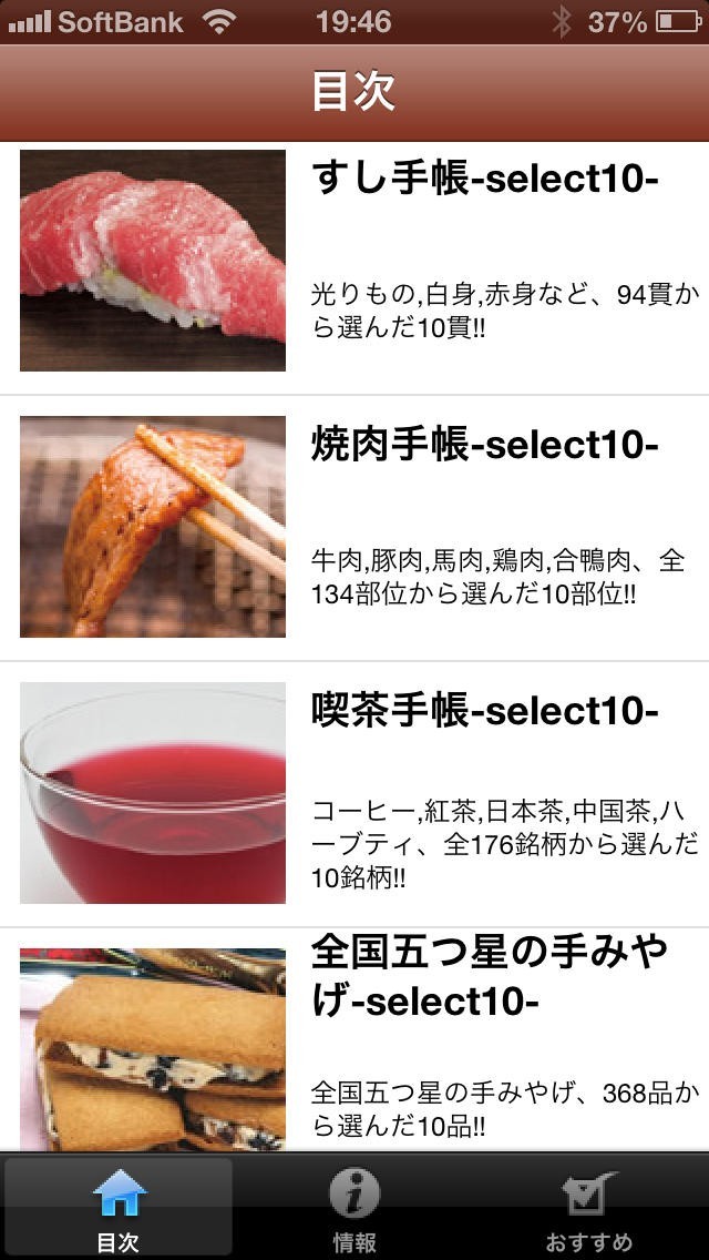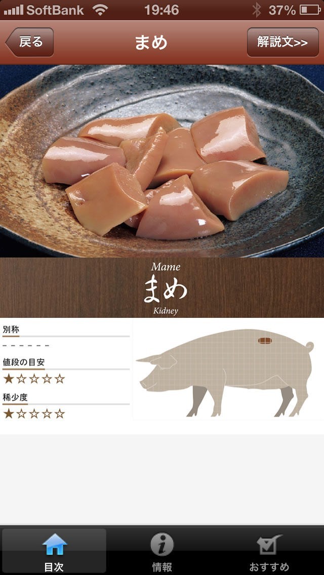 App Storeより引用すしネタ・焼肉部位・喫茶銘柄・手土産品から厳選した、美食知識満載なアプリ。
