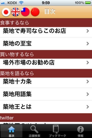 お寿司などの新鮮でおいしい食べ物を食べることが出来るということで、近年市場関係者だけでなく、一般人や観光客にも大人気の築地市場ですが、素人にはどのお店に行ったらいいのか、何時からやっているのかもわかりません。そんな時にこの築地王の築地手帳アプリがあれば、築地の専門家がオススメのお店を紹介してくれるので迷うことなく築地を楽しむことができるようになります。築地で買い物をしたいときにもジャンルごとに専門店を分類してあるのでどこで買えばいいのか一目瞭然です。