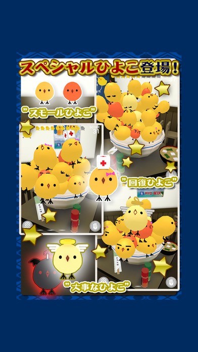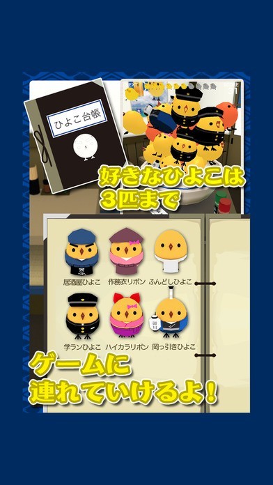 ゲームプレイには、ガチャを引いて集めた衣装ヒヨコの情報が記録されている"ヒヨコ台帳"から、お気に入りの衣装ヒヨコを3匹選択してゲーム内で使用することができます。