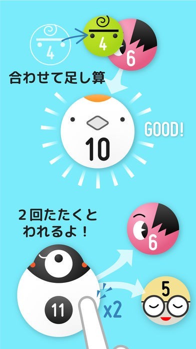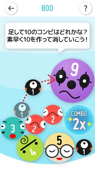 "SUM! - かわいい数字で算数遊び!"は、キャラクターにふんした数字を操作して、"10"を作るパズルゲームで、足し算や引き算の概念を、楽しく遊びながら学習できるアプリとなっています。画面上に落ちてくる数字のキャラを操作し、数を足したり引いたりする事で"10"のキャラを作っていくと言うもので、シンプルなルールながら思考力が鍛えられ、繰り返し遊ぶ事で、自然と足し算や引き算に親しむ事ができます。また、キャラを2回以上タップすれば、タップした数字が分解され、数字を分解する知識まで知らず知らず身についていきます。このようにゲーム感覚で、楽しく足し算や引き算を楽しく学習したいお子様に最適です。