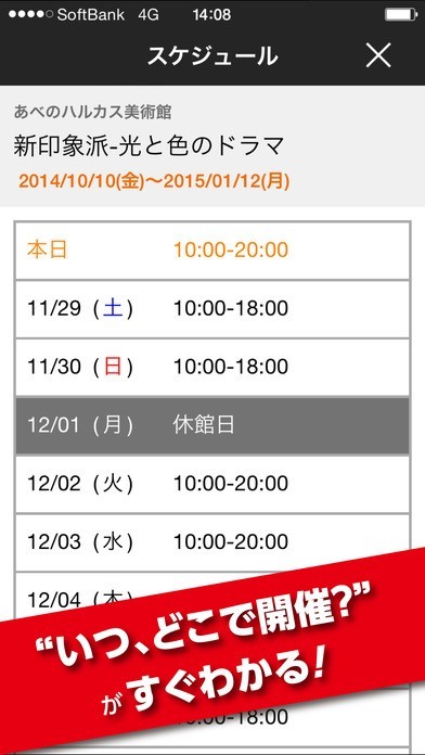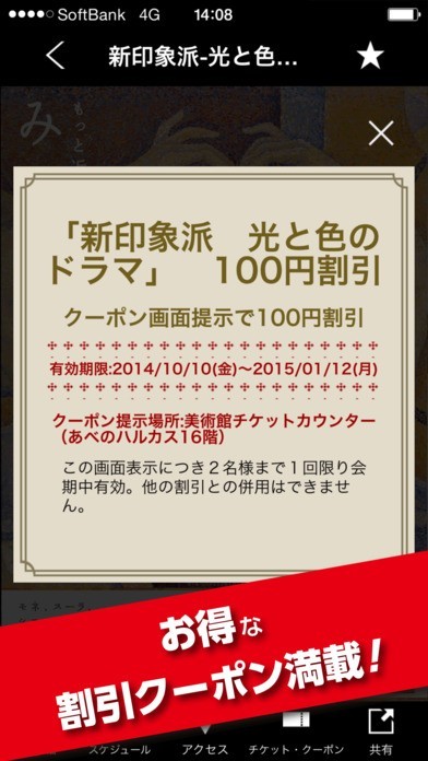 ・「詳細(料金や開催期間)」「スケジュール(開館時間)」「アクセス情報」「チケット/クーポン」などの情報も確認