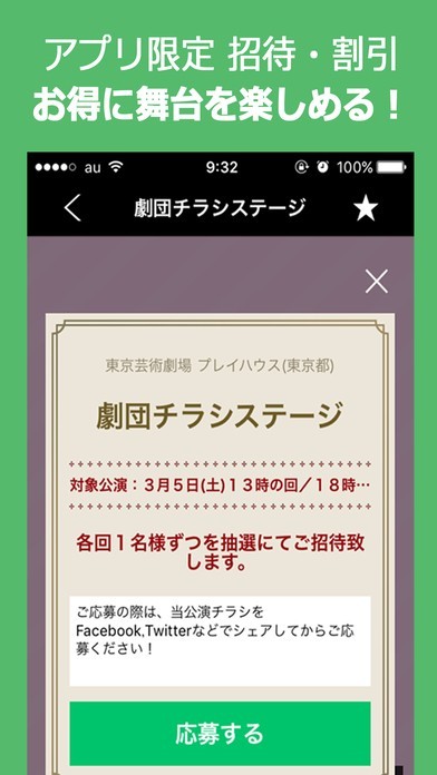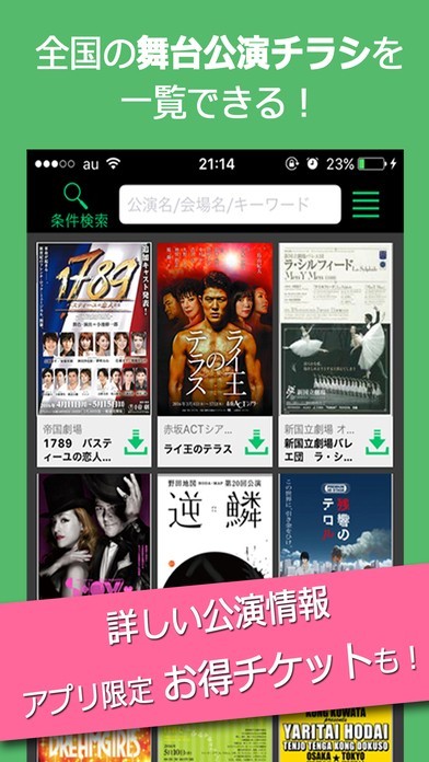 このアプリを利用することによって、チケットの割り引きや招待などといったサービスを受けられて、お得に舞台を見に行くことが可能になります。 なかなか情報が得ることができない歌舞伎などのチラシを閲覧することが出来て、そのような場所に行くきっかけを作ってくれます。 その他にも気になったものがあれば、星マークをさわることでお気に入りに簡単に登録することができます。 他には、条件検索によって、地域やジャンルを絞って検索を行うことができます。