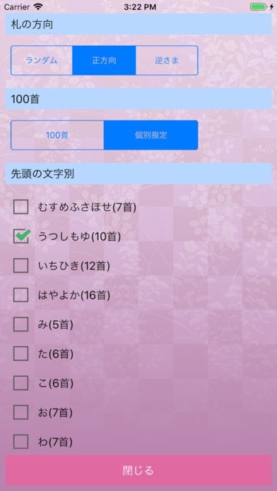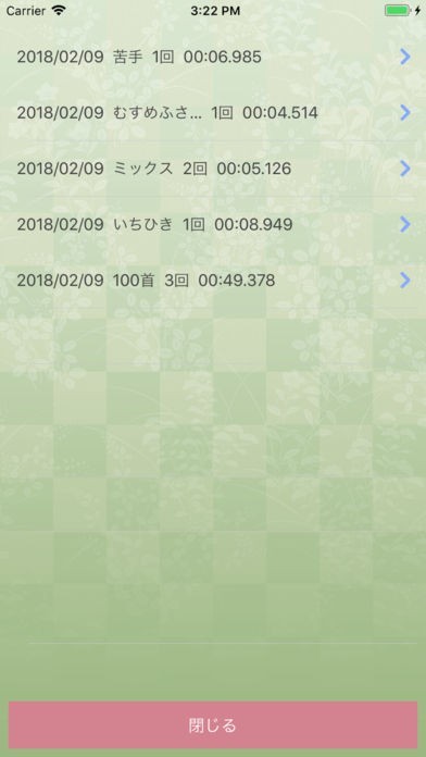 表示された取り札の決まり字を言えたらスワイプして札を払っていきます。札を払うと決まり字が表示されるので答え合わせができます。全ての札を払うまでの時間を短縮できるようにトレーニングしていきます。