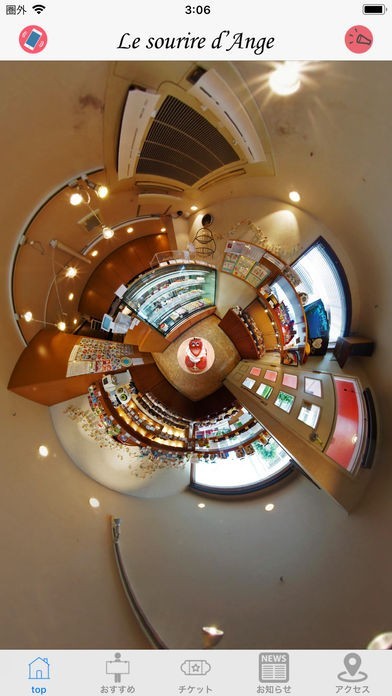 360度パノラマ画像でのお店の内観の閲覧や、お店へのアクセスなどの店舗情報の確認、またお得な情報などの最新のお知らせを確認することができるアプリケーションです。