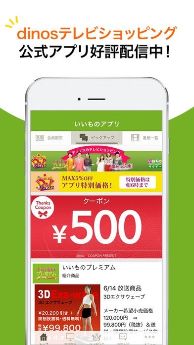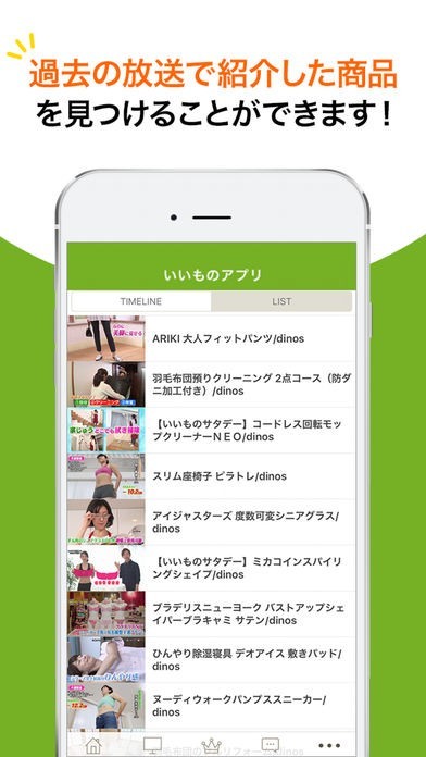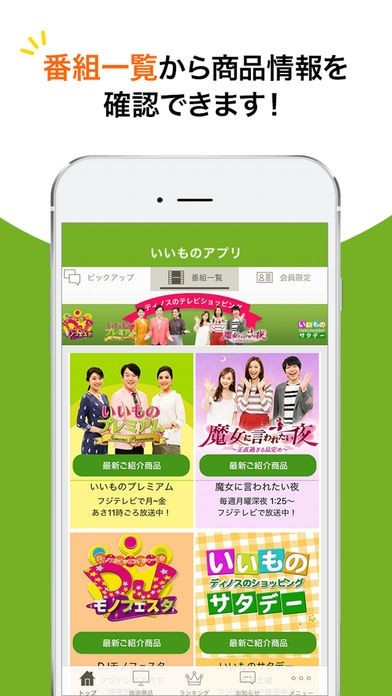 いいものアプリは、dinosの商品の情報やクーポンを探すことができ、商品を探したいときは番組一覧より見つけられます。番組で見たほしい商品を探しやすく、金額や商品内容が確認できるので購入するときの参考になります。