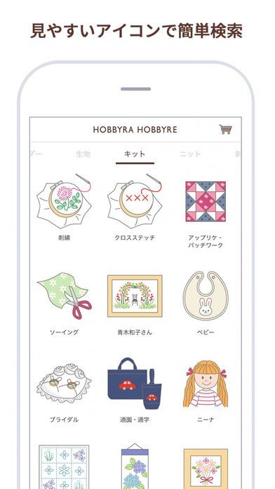 5千点以上のアイテムから、生地や毛糸、刺繍キットなど、見やすくてかわいいアイコンで簡単に検索できます。