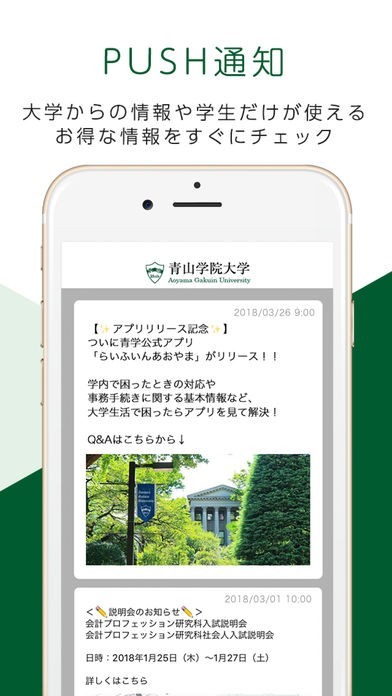 App Storeより引用青山学院大学の学事歴・行事・イベント情報から、サークル、各種SNSまで、青学生が知りたい情報満載の公式アプリ「らいふんいんあおやま」が誕生しました!