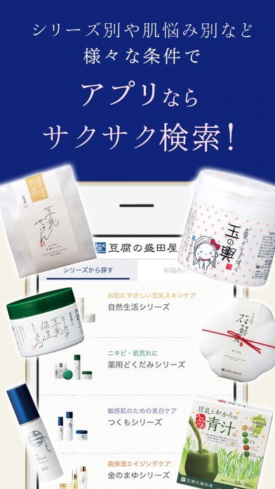 豆腐の盛田屋の公式アプリで、お肌のお悩み別でおすすめのケア商品を検索することができます。ランキング機能も搭載されているので、売れ筋商品を把握することも可能です。