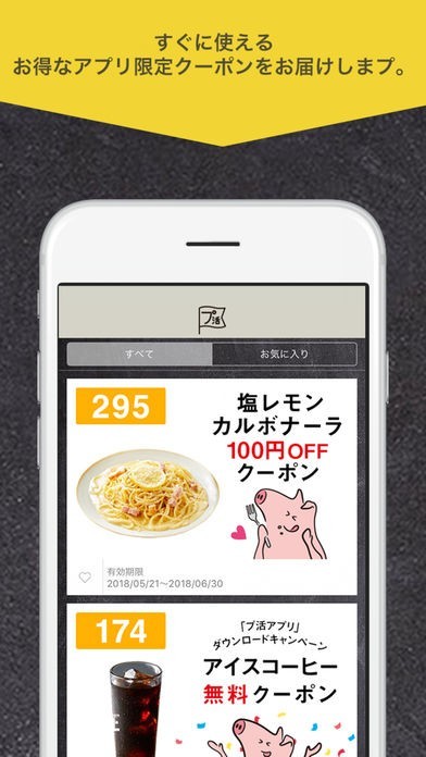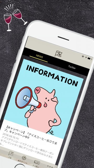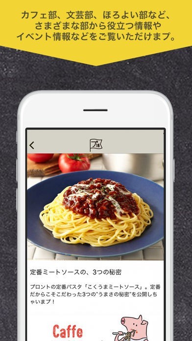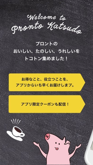 カフェとバーの二つの顔を持つプロントをさらに楽しく利用することができるコンテンツが満載の公式アプリとなっていて、新メニューやお得なキャンペーンなどの最新情報を配信しています。