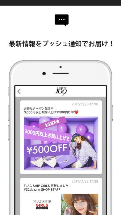 プッシュ通知機能が搭載されているので、渋谷109のお得なキャンペーン情報や最新のニュースなどをスマートフォンにプッシュ通知でお知らせしてもらうことが可能となっています。