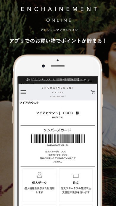 オンラインストアにログインすると会員バーコードを表示できます。アプリでポイントを貯められます。