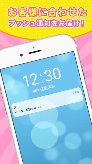お得な情報をプッシュ通知でお知らせします。アプリの初回起動時にプッシュ通知を「ON」に設定するようお願いします。なお、オン・オフの設定は後から変更もできます。